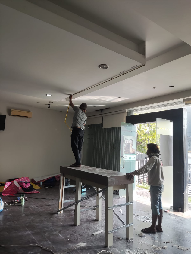 Memasang elemen interior seperti plafon, partisi, dan furniture secara profesional.